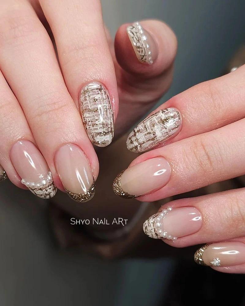 黑白灰交织的经典组合,配上金属线条与珍珠饰扣,这是毛呢美甲中最经典、最有代表性的款式!适合搭配套装或羊毛外套,整个人瞬间高级感加倍。