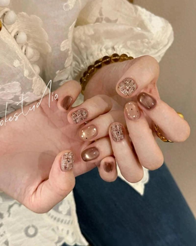 以奶茶雾面底色为基调,交织上白色细线,像是穿上一件针织毛衣细致又柔软。微微的雾光让整体更干净、温柔,搭配米白扣或细金线更显气质!这款毛呢美甲在日常和正式场合都能够完美驾驭!
