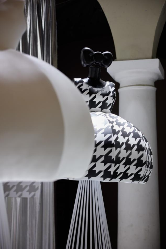 继续向前探索,迈入黑白千鸟格勾勒的精奢空间,高定手工坊沉浸展拉开帷幕。