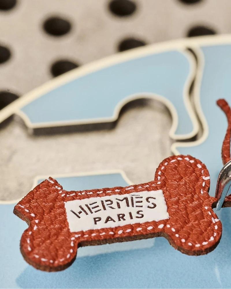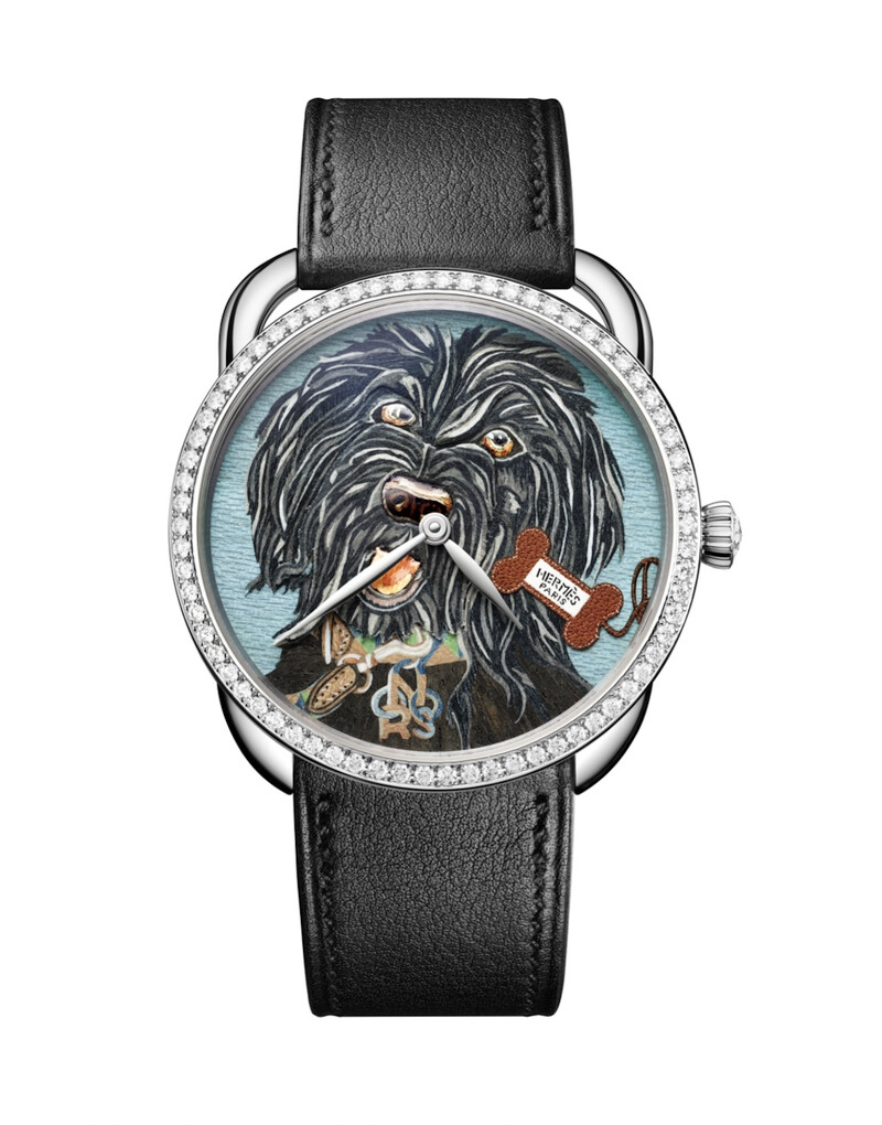 首先出场的是黑白相间双色的毛茸茸小狗Orson。其图案主要以木片镶嵌工艺精制:过程如拼图一般,每个部位细节需事先定位、切割,再组装黏合;其嘴巴、眼睛、鼻子和舌头皆再上色,总数有八种不同木片材质构成,让光影和层次更具丰富生命力。戴着猫眼墨镜的小狗Amy, 面盘图案聚焦镌刻与微绘:细腻笔触需经过多次反复烘烤才得以成形。最后,白色的Taco以微绘及掐丝珐琅工艺精心汇成:表盘底部先以蓝色珐琅烧制,再于表面手工绘制卷曲毛发,另外,是掐丝珐琅工艺(先以粗细不一的金丝勾勒轮廓,并在烧制过程中融入珐琅)凸显毛流和五官的立体层次。骨头造型名牌则以皮革工艺制成——再次巧妙回扣爱马仕的工艺精神核心之一。