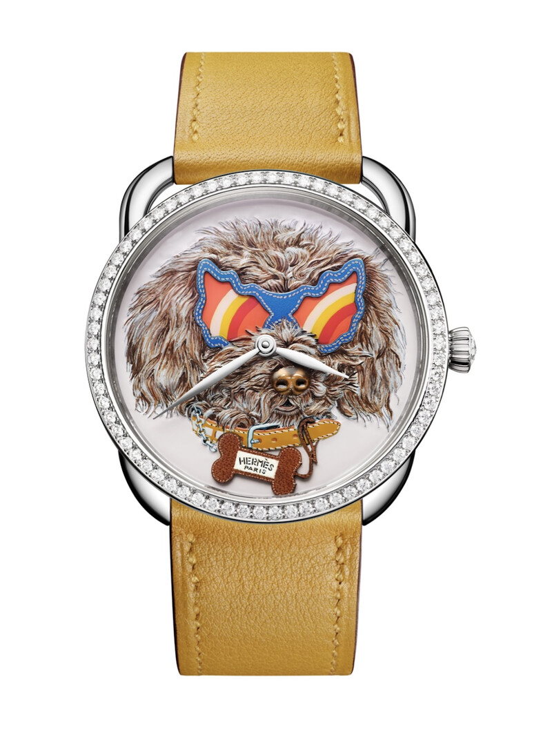 爱马仕Hermès用温柔笔触、风趣设计和质感工艺,叠加出可能是钟表世界里最“受宠”的那片腕间风景:全新三款狗狗面盘图案限量表。
