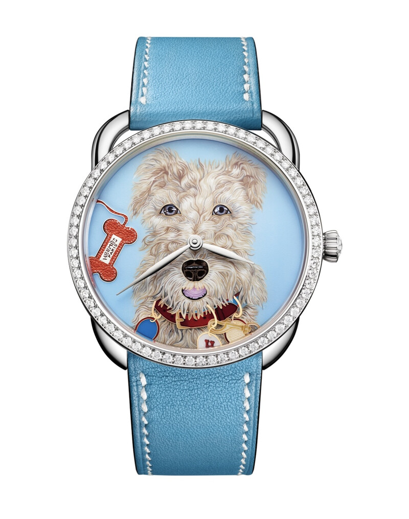 在Hermès多个腕表系列中,诞生于1978年、出自Henri d’Origny 设计的Arceau,以流畅优美的线条曲线和不对称表耳巧思,转化了马镫造形和品牌马术渊源,是一眼可辨的品牌讯息。这次,爱马仕毫无悬念地选择带有一丝玩味的Arceau,成为新成员狗狗们的最新“舞台”。